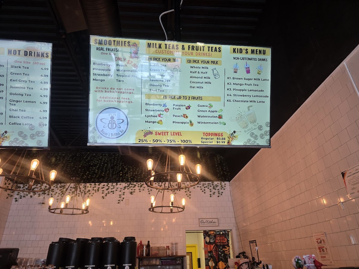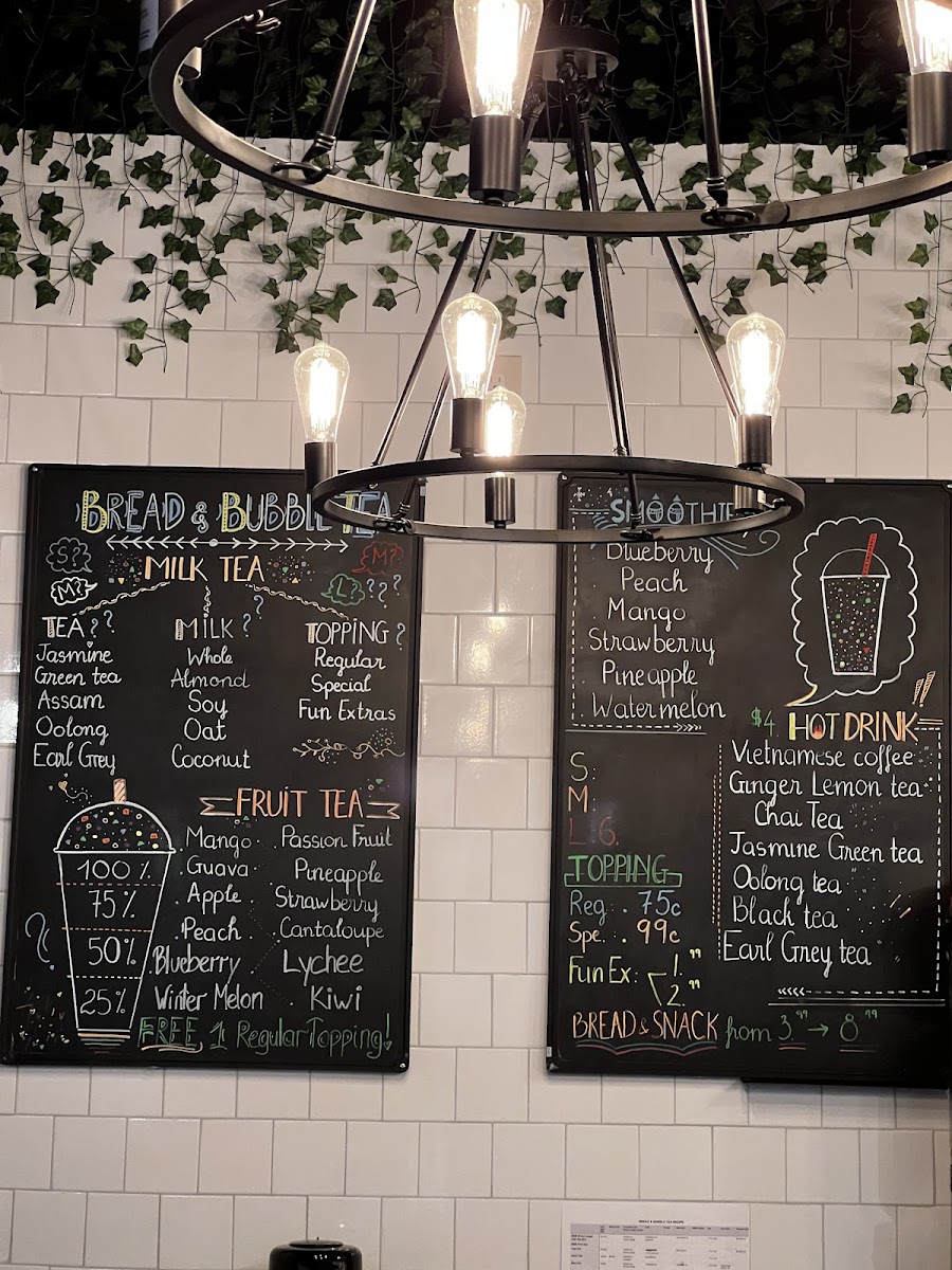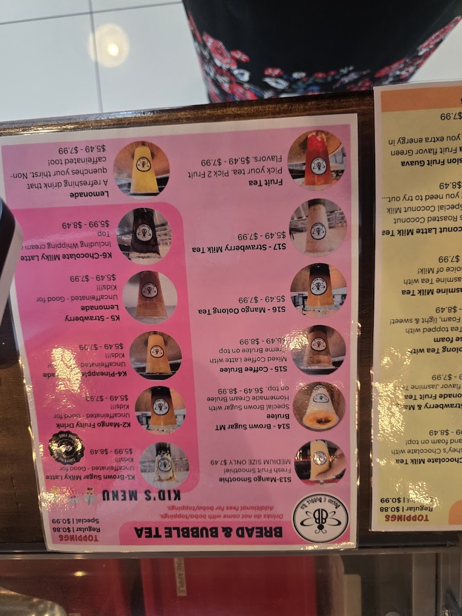 From a reviewer’s perspective, the menu at Bread & Bubble Tea offers a pleasant variety of snacks, drinks, and desserts that cater to different tastes. The pastry and snack section features items like Bread Cheese Stick, Chocolate Bread, Hazelnut Bread, Raisin Bread, and the savory Chicken & Cheese Sandwich, which pair nicely with their drink selection. Their beverage menu is quite extensive, including Milk Tea under custom milk tea, and kid-friendly options such as K1-Brown Sugar Milky Latte, K2-Mango Fruity Drink, K3-Pineapple Lemonade, K4-Strawberry Lemonade, and K5-Chocolate Milky Latte. For hot drinks, customers can enjoy H-Black Coffee, H-Coffee Latte, H-Black Tea, H-Chai Tea, and H-Earl Grey Tea. The smoothie lineup includes Blueberry Smoothie, Mango Smoothie, Peach Smoothie, Pineapple Smoothie, and Strawberry Mango Smoothie, while the specialty drinks menu highlights S0-Brown Sugar Latte - Caffeine-Free, S1-Brown Sugar Milk Tea, S2-Thai Milk Tea, S3-Taro Milk Tea, and S4-Organic Matcha Latte. Customers looking for refreshing options can try Fruit Tea, Lemonade Fruit Tea, or Lemonade. For dessert, the menu offers treats like Cream Brûlée, Dubai Chocolate Bar, Dubai Strawberries, Ice Cream - Mango, and Ice Cream - Peach, along with limited-time drinks such as Japanese Sparkling Water-Strawberry and Ocean Bomb - Flavored Sparkling Water, making the menu well-rounded and appealing for both snack lovers and bubble tea fans.