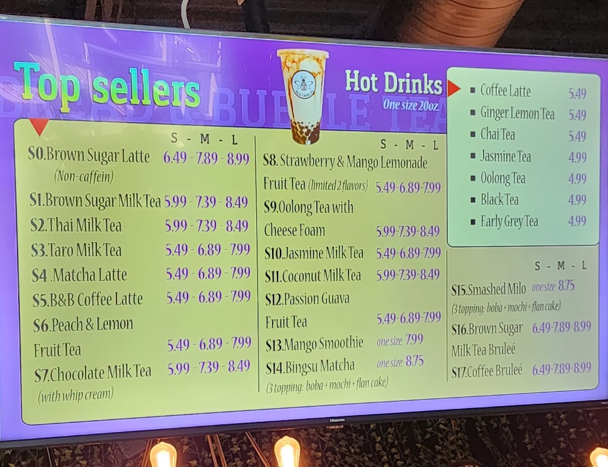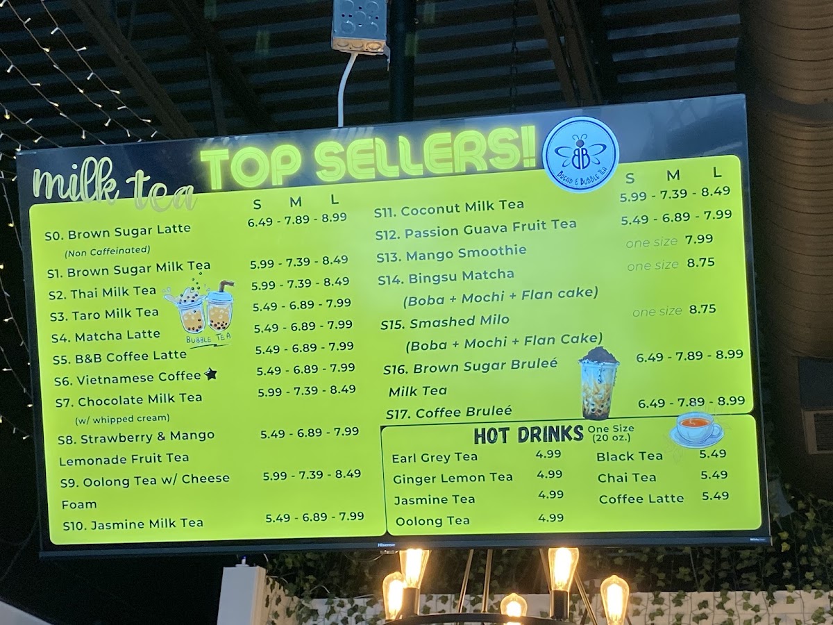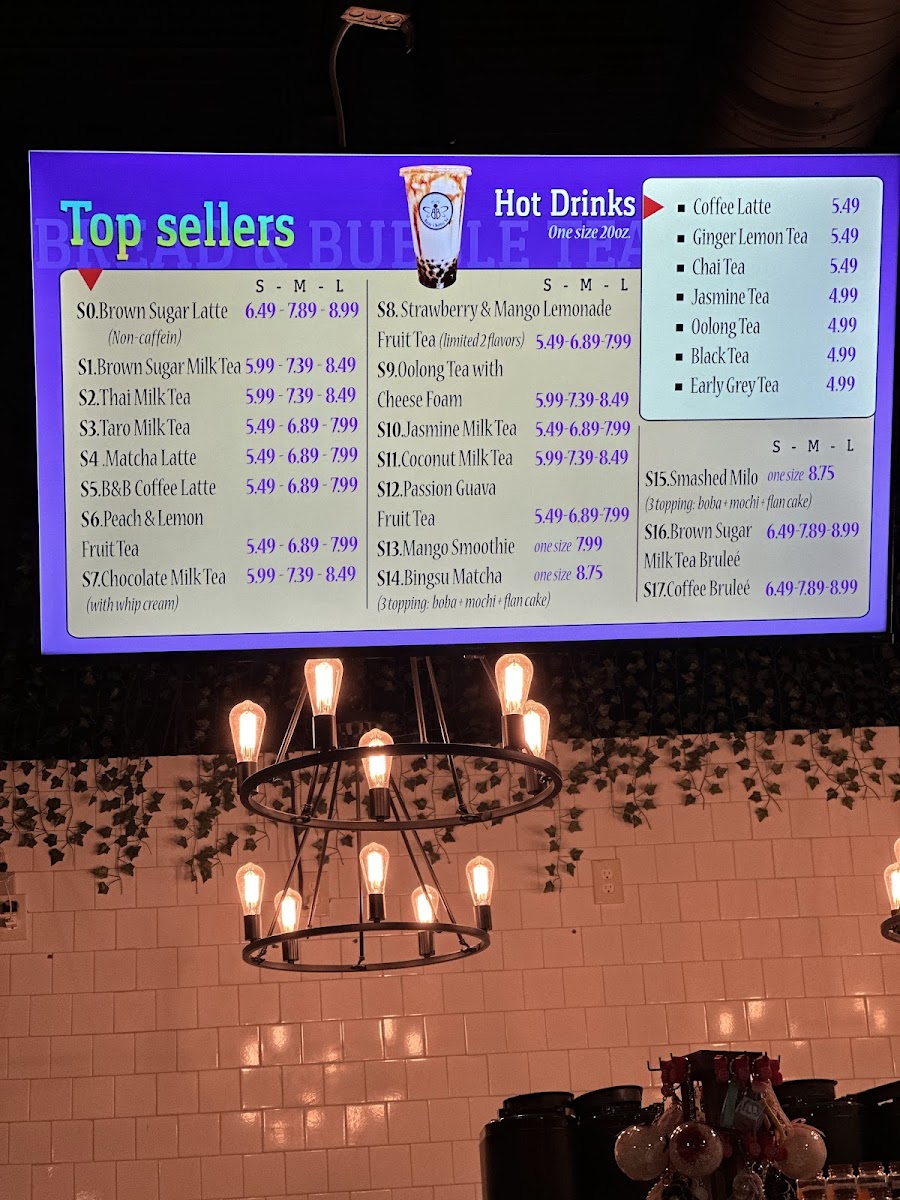 From a reviewer’s perspective, the menu at Bread & Bubble Tea offers a pleasant variety of snacks, drinks, and desserts that cater to different tastes. The pastry and snack section features items like Bread Cheese Stick, Chocolate Bread, Hazelnut Bread, Raisin Bread, and the savory Chicken & Cheese Sandwich, which pair nicely with their drink selection. Their beverage menu is quite extensive, including Milk Tea under custom milk tea, and kid-friendly options such as K1-Brown Sugar Milky Latte, K2-Mango Fruity Drink, K3-Pineapple Lemonade, K4-Strawberry Lemonade, and K5-Chocolate Milky Latte. For hot drinks, customers can enjoy H-Black Coffee, H-Coffee Latte, H-Black Tea, H-Chai Tea, and H-Earl Grey Tea. The smoothie lineup includes Blueberry Smoothie, Mango Smoothie, Peach Smoothie, Pineapple Smoothie, and Strawberry Mango Smoothie, while the specialty drinks menu highlights S0-Brown Sugar Latte - Caffeine-Free, S1-Brown Sugar Milk Tea, S2-Thai Milk Tea, S3-Taro Milk Tea, and S4-Organic Matcha Latte. Customers looking for refreshing options can try Fruit Tea, Lemonade Fruit Tea, or Lemonade. For dessert, the menu offers treats like Cream Brûlée, Dubai Chocolate Bar, Dubai Strawberries, Ice Cream - Mango, and Ice Cream - Peach, along with limited-time drinks such as Japanese Sparkling Water-Strawberry and Ocean Bomb - Flavored Sparkling Water, making the menu well-rounded and appealing for both snack lovers and bubble tea fans.